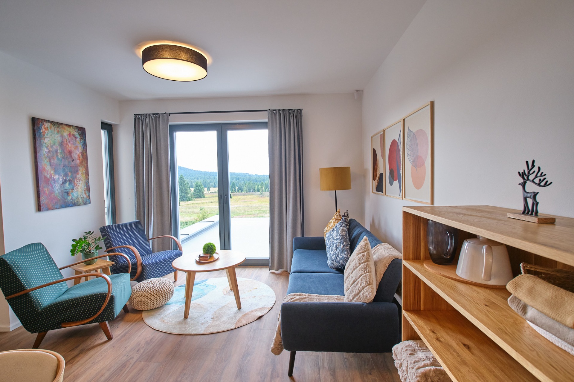 Nové moderní rodinné apartmány na Božím Daru nabízejí útulné zázemí pro vaši horskou dovolenou. Dvě samostatné ložnice, plně vybavená kuchyň, obývací pokoj, dvě koupelny a výhledy do přírody. Každý apartmán má 92m2. Parkování v podzemní garáži s možností dobití elektromobilů, lyžárna/kolárna a běžkařské trasy hned za domem. Ideální pro odpočinek i aktivní dny na horách – ať už jedete s rodinou, přáteli nebo si chcete jen tak odpočinout od každodenního shonu.